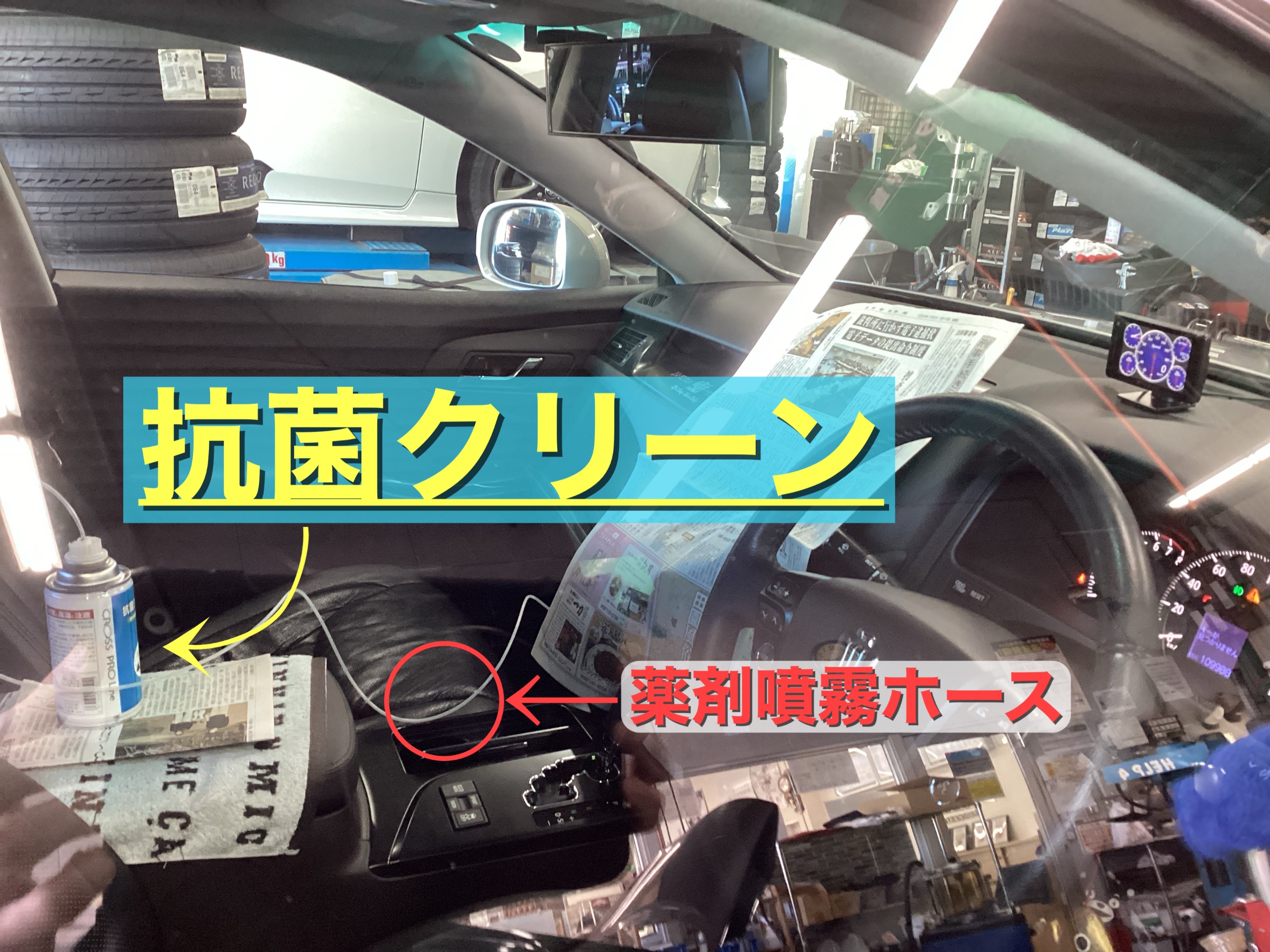 ホースは二股になっていて車内にも噴霧しています。