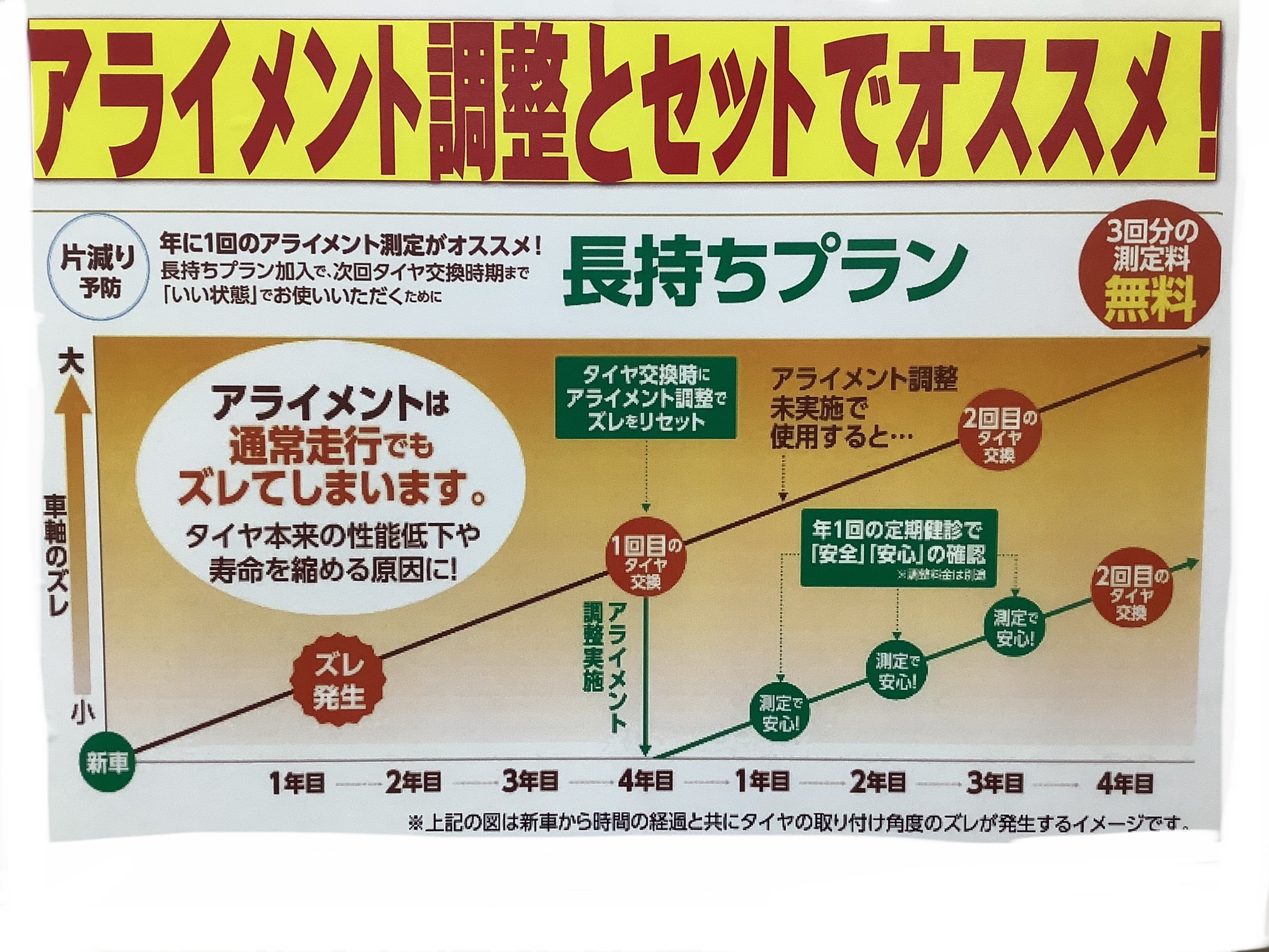 そして当店でタイヤとアライメント調整をセットでご希望されるお客様にご紹介しておりますのが『タイヤ長持ちプラン』です!