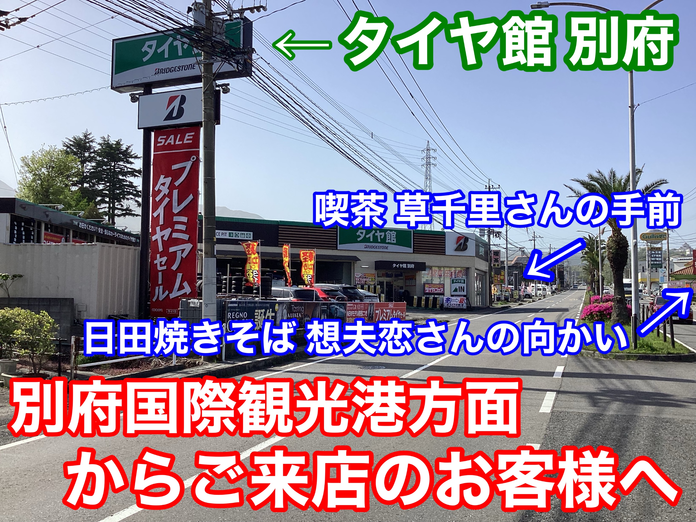 右手に「日田焼きそば想夫恋 別府春木店さん」、その前に【タイヤ館別府店】があります。
