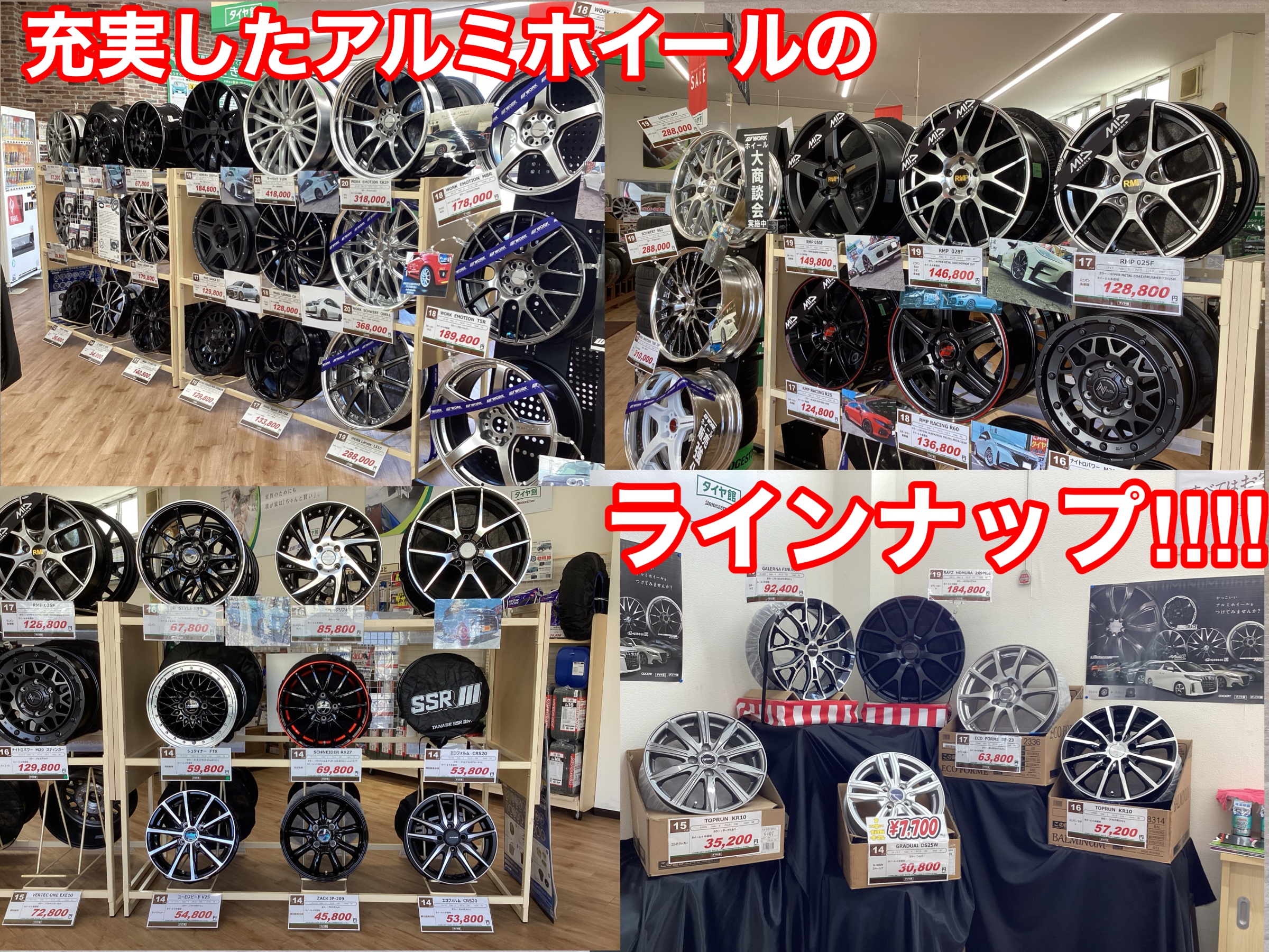当店の展示コーナーにはRAYS、WORK、WEDSと一流ブランドのホイールが一望できます!!
