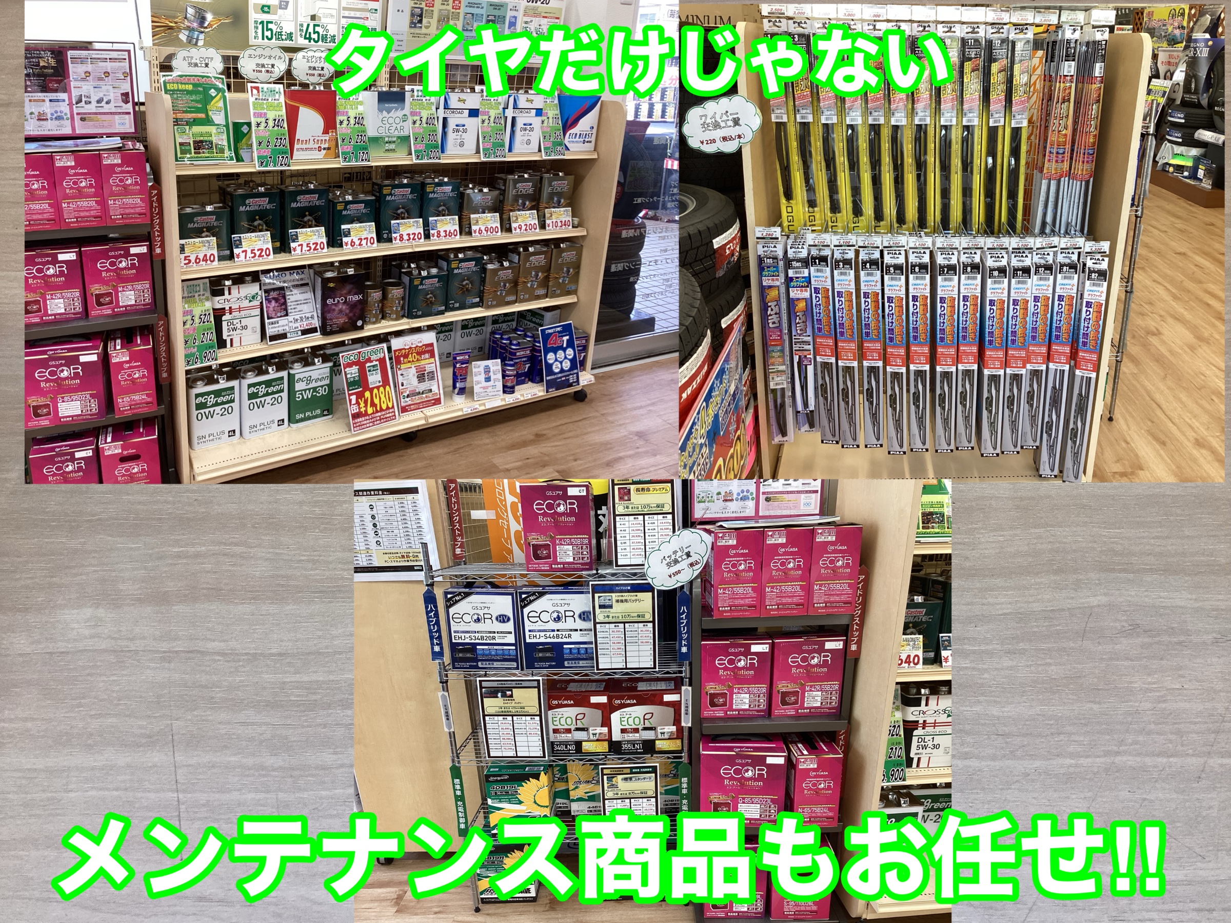 当店ではバッテリー、オイル、ワイパーなどのメンテナンス用品の販売、交換も可能です。