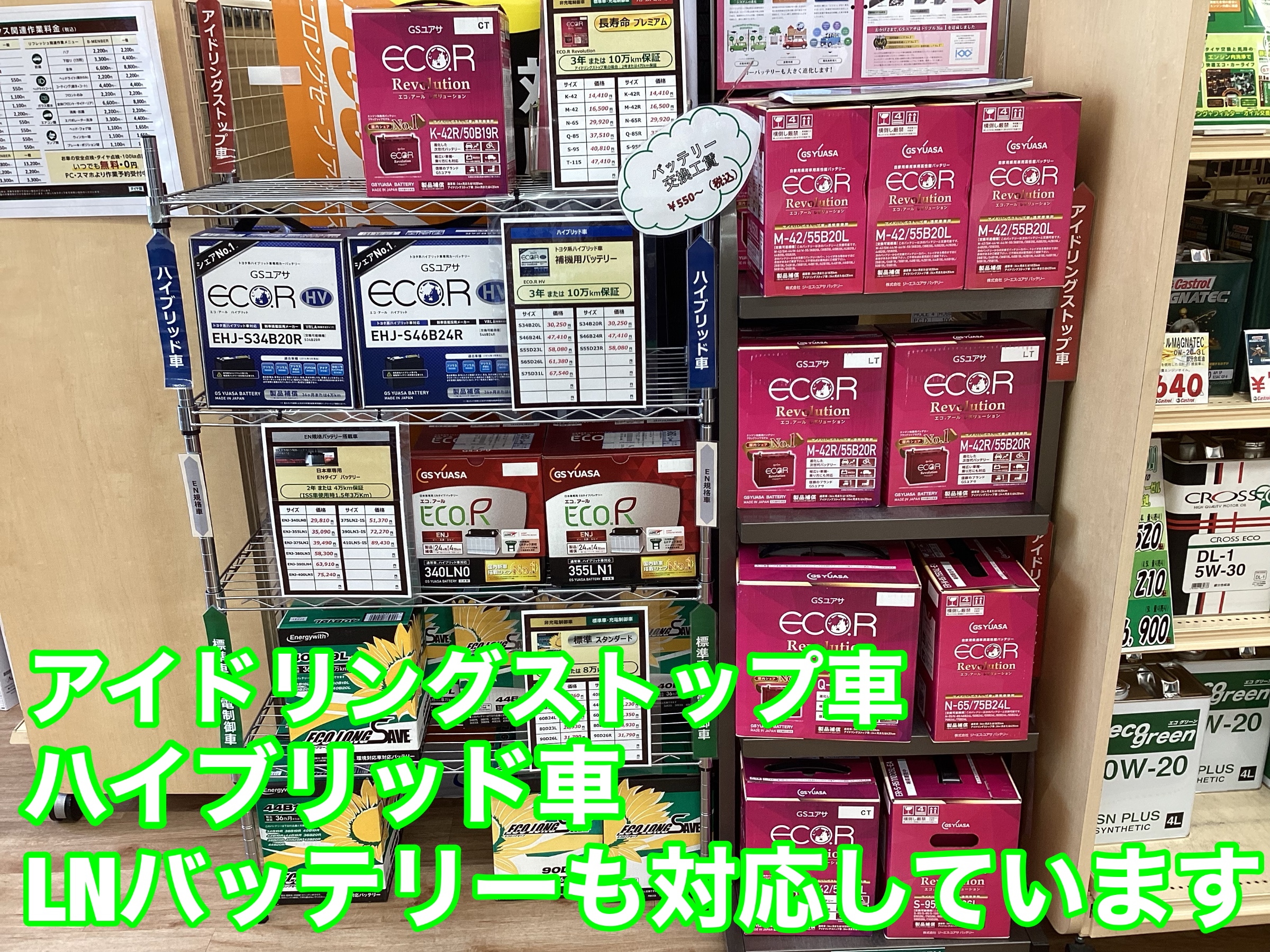 バッテリーはISS(アイドリングストップ)、ハイブリッド車、LNバッテリーも対応です。