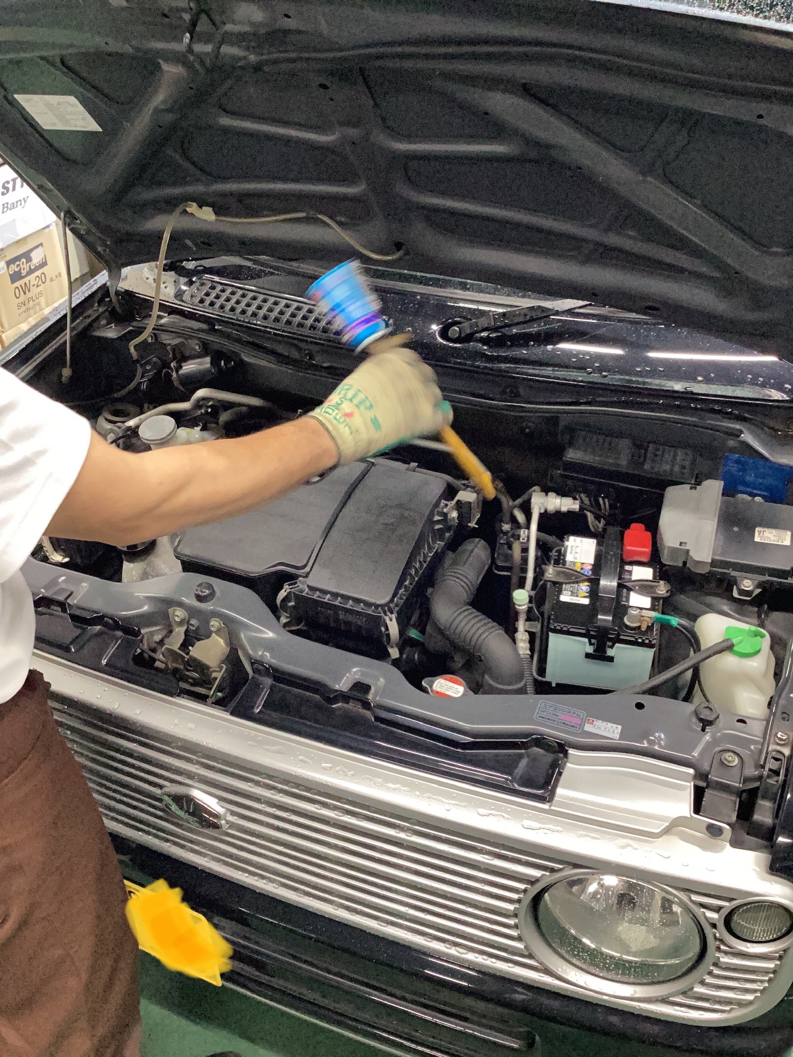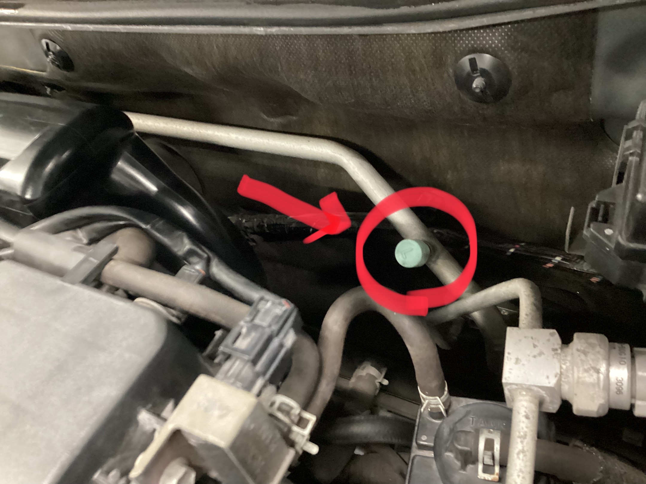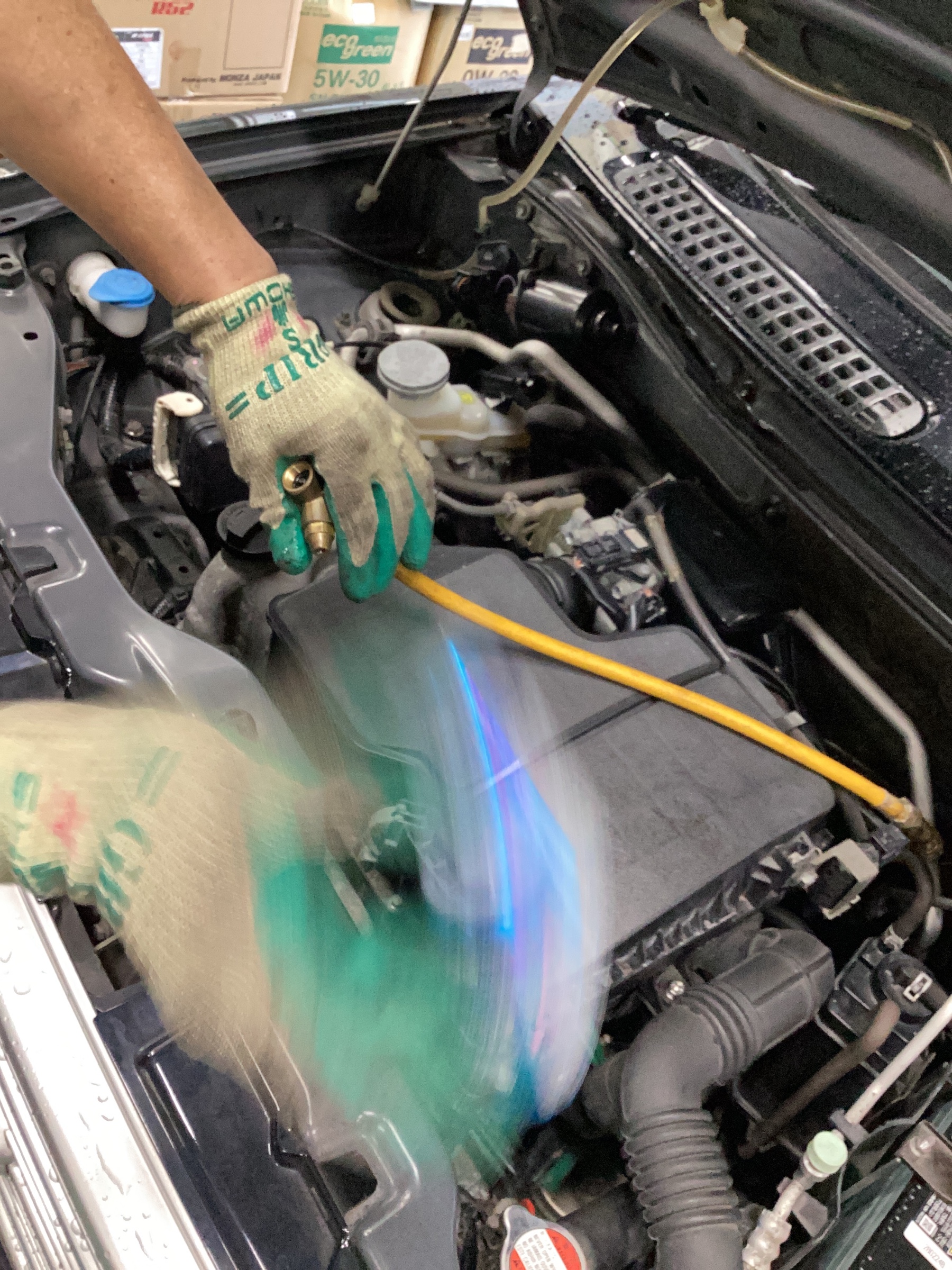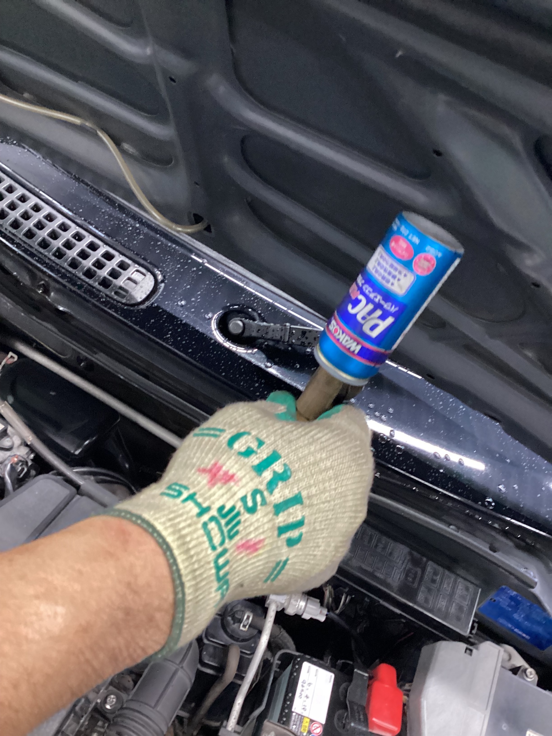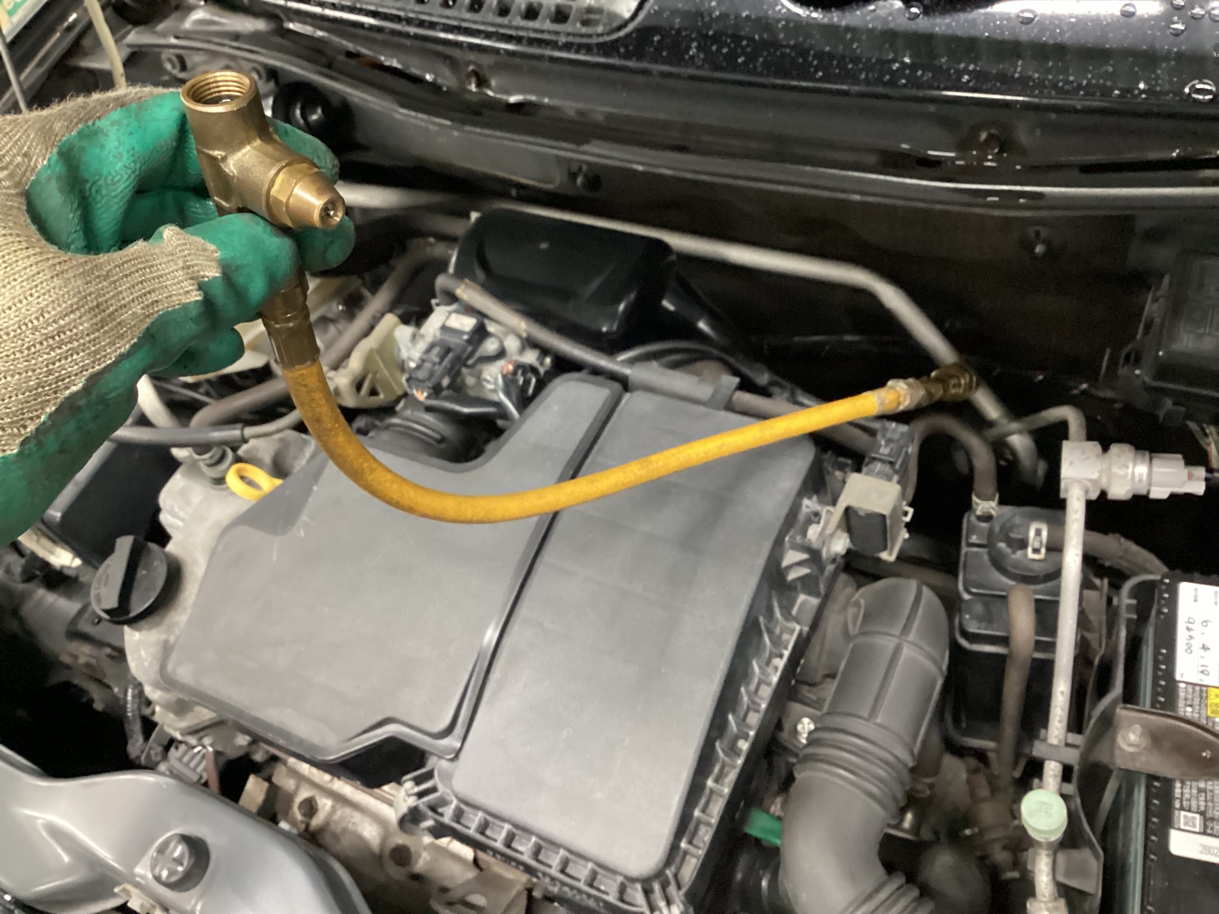 お車のエンジンルーム内にあるエアコンのパイプラインのL側に注入器具を繋ぎます☆