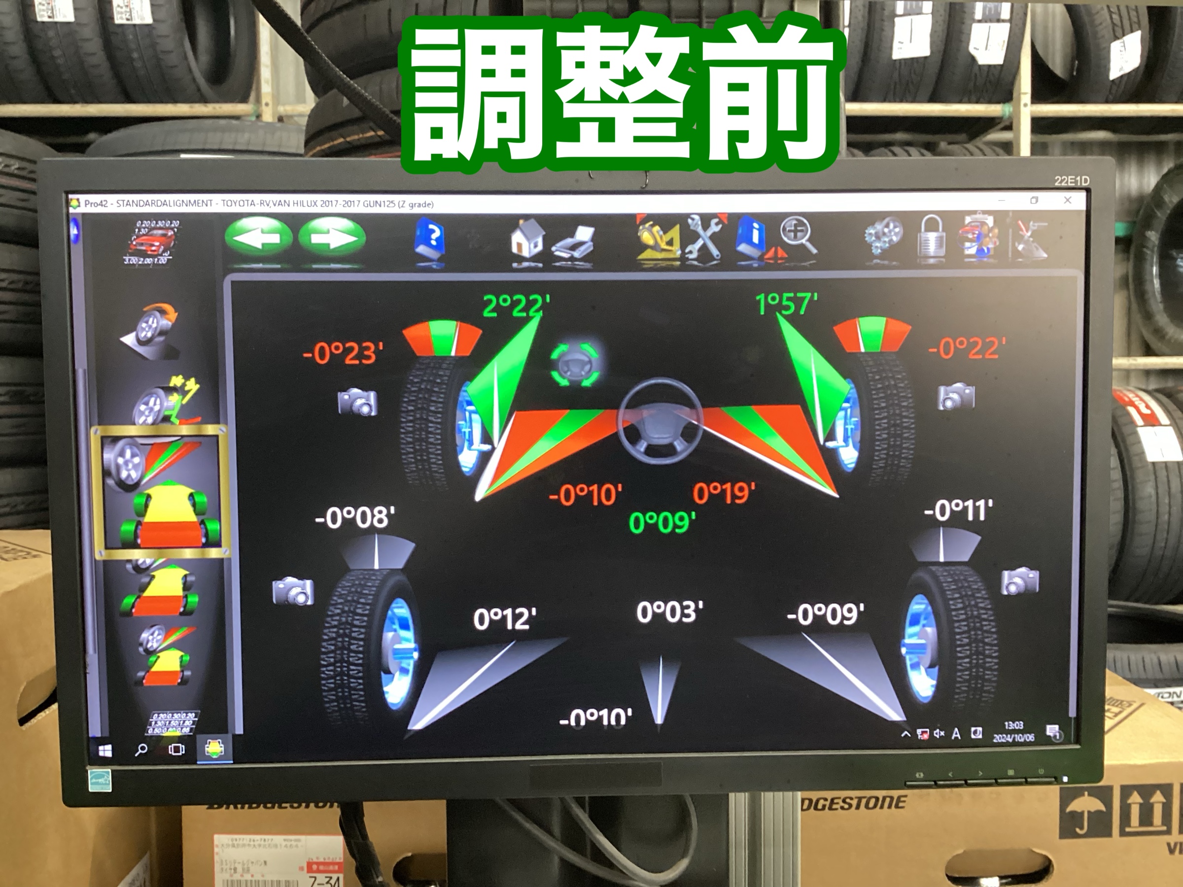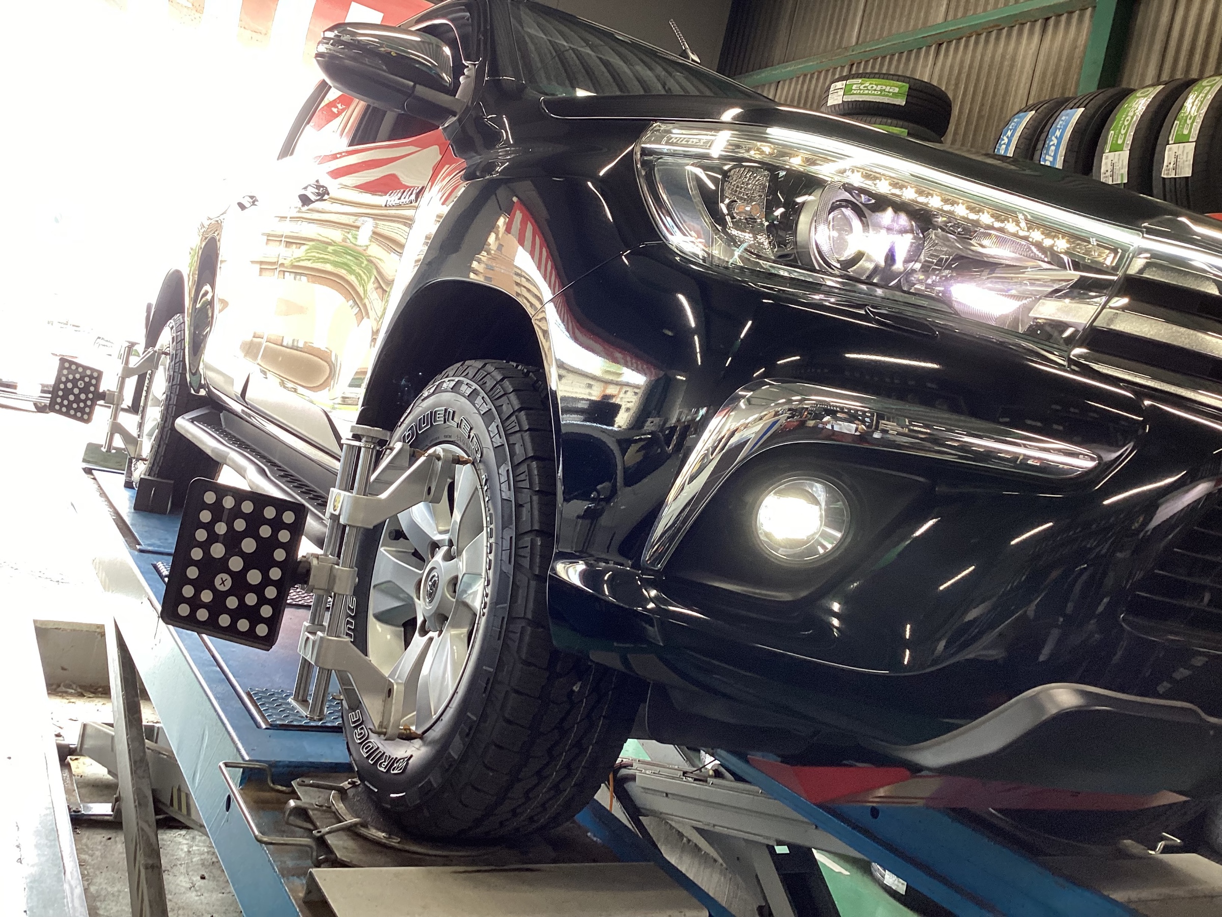 今回の作業案内はトヨタのハイラックスのタイヤ交換&四輪トータルアライメント調整をさせていただきました☆