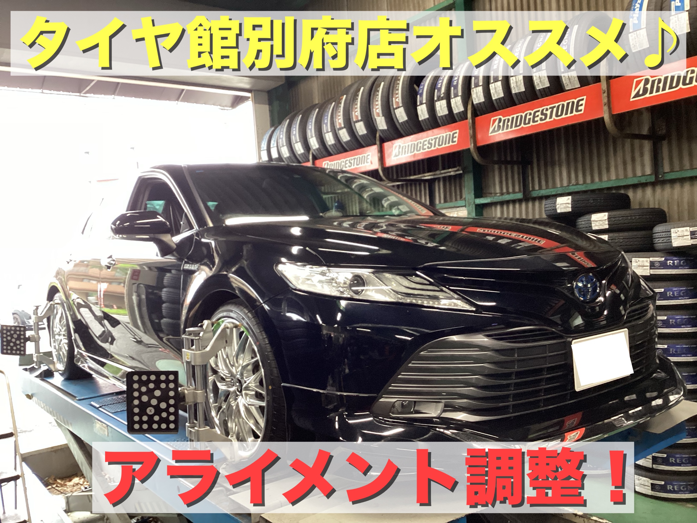 ホイール&車高調取付後はタイヤ館別府店オススメのアライメント調整作業も行います。