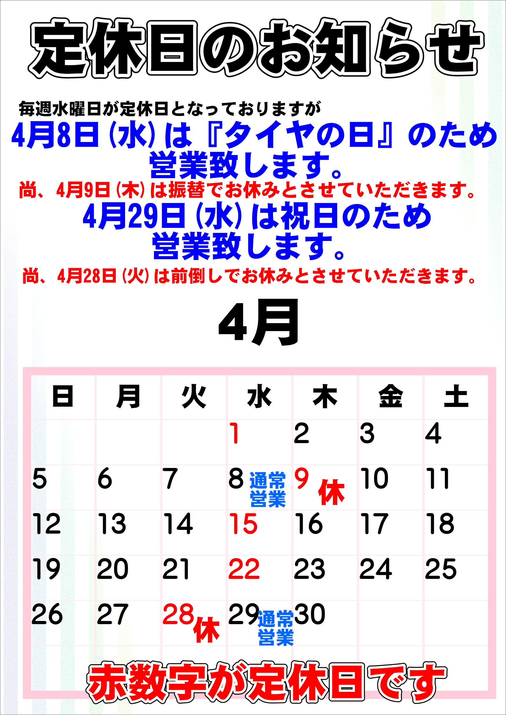 本日は店休日です⭐︎ ポスト 2026年4月15日 いつも当店のご利用、誠にご利用ありがとうございます。 本日、15日は定休日となっております‼︎‼︎ お間違いのないようご注意ください。 タイヤ館 別府 住所:874-0000大分県別府市大字北石垣1464-1 電話番号: 0977-26-7877 相談予約 担当:矢野
