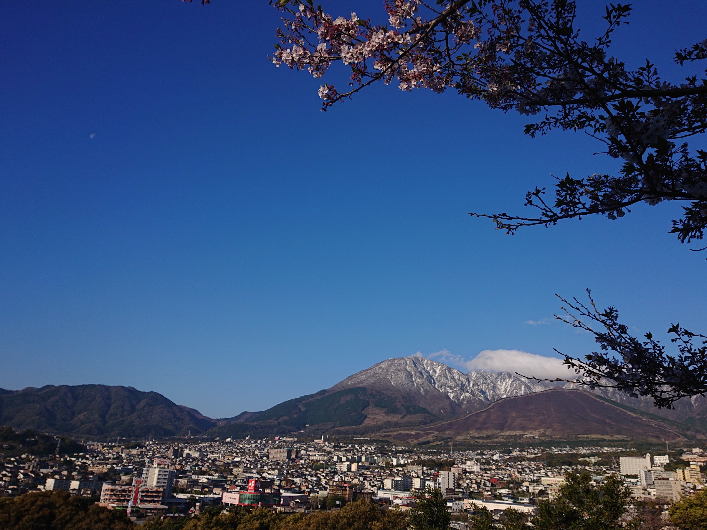 空の蒼と山の白、桜のピンク色のコントラストが美しいです♪
