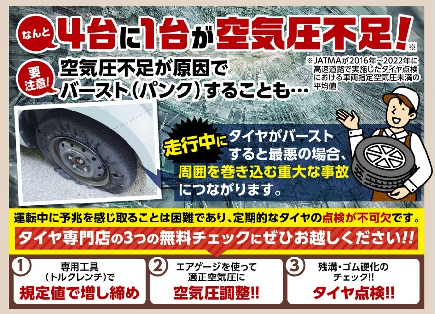 JATMAの調査では【4台に1台が空気圧不足】というデータがあります