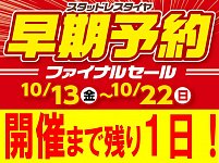 皆様、こんにちは! いつもタイヤ館ビィ・ワークス登別をご利用いただきありがとうございます♪ いよいよ明日スタートです! 10/13(金)~10/22(日)まで 「スタッドレスタイヤ早期予約ファイナルセール」開催いたします!! 開催まで残り1日!! 早期予約のファイナルですよ(=゚ω゚)ノ 今お...