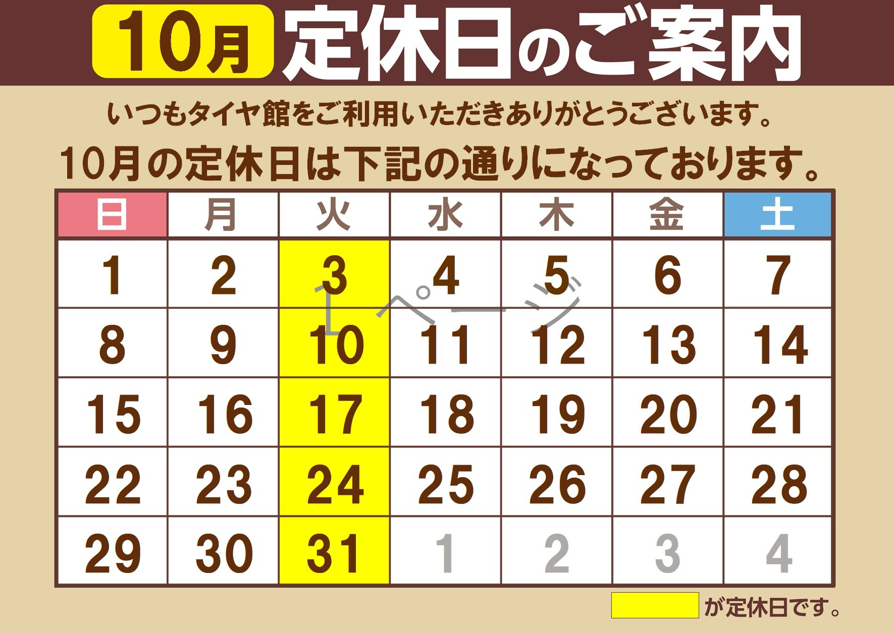 いつもタイヤ館ビィ・ワークス登別店をご利用頂きありがとうございます。 10月の定休日のお知らせです。 火曜日は定休日となっておりますので、 ご来店の際はお間違えの無いよう宜しくお願い致します。 10月も皆様のご来店心よりお待ちしておりますm(__)m