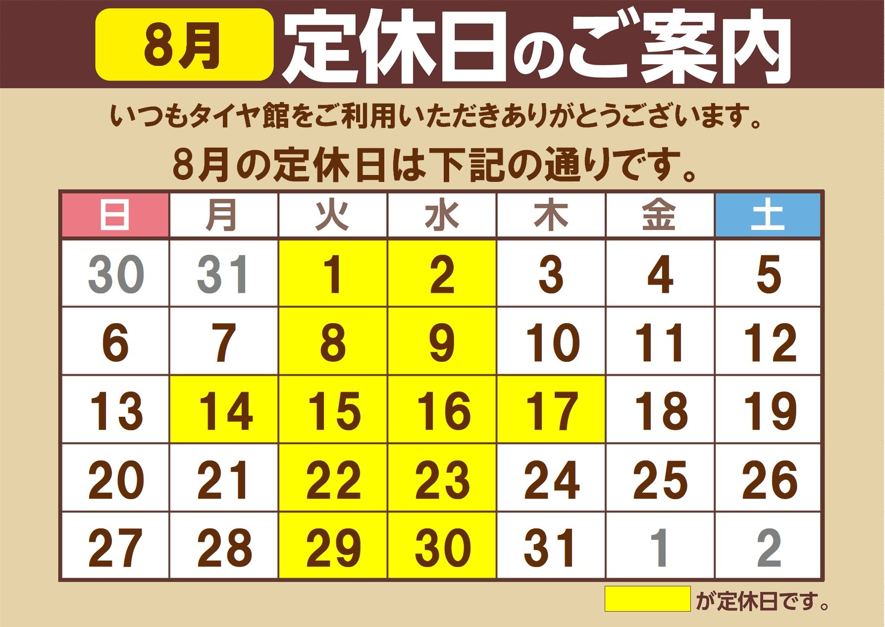 いつもタイヤ館ビィ・ワークス登別店をご利用頂きありがとうございます! 8月休業日のお知らせになります。 当店スタッフ不足により、 8月は火曜定休日に加え、水曜日も定休日とさせて頂きます。 お客様には大変ご迷惑をお掛け致しますが、 何卒ご理解の程、宜しくお願い致しますm(__)m また、8/14...