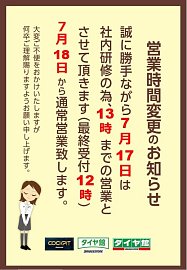 誠に勝手ながら本日7/17(木)は社員研修のため 営業時間を13時までとさせて頂きます 大変ご不便をおかけいたしますが 何卒ご理解賜りますようお願い申し上げます