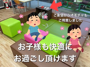 当店ではお客様がお待ちいただいている時間を快適にお過ごし頂くため 様々な設備をご用意しております キッズスペース(ご要望によりおもちゃを追加しました) ネットが欠かせない時代ということで 店内に「フリーWi-Fi」設置しております♪♪ ID・パスワードは店内にて掲載しております 喫煙スペース...