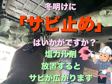 記事一覧 ☆防錆☆サビ止め☆塩カル対策☆登別☆室蘭☆タイヤ館へお任せください! お車の錆対策してますか? いつもタイヤ館ビィ・ワークス登別店をご利用頂きありがとうございます 当店ではオイル交換やタイヤ交換のついでに下回りの防錆コーティングが人気です! 皆様はお車の下回り見たことありますか? 冬場の塩カル対策は勿論、地区によっては潮風による塩害も受けます。 そし... 2026年4月11日 ポスト