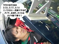 今年は、3/23、5/17、9/14、11/23で行います。 場所は茂原サーキット!! 参加者には特典として・・・ オイル・・タイヤの割引特典が・・ タイヤ館千葉にきて 瀬川に・・・ (;゚Д゚)!オイ (゚Д゚)ノはいぃぃ? (´∀`*)走行会参加したいんだけど・・タイヤがねぇ・・ (;゚Д゚)!任せてください!!頑張ります...