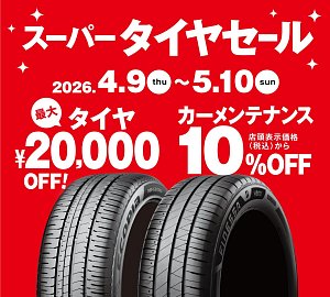 2026年4月9日~2026年5月10日 スーパータイヤセール開催しております ゴールデンウィーク前のお出掛け準備も一緒にいかがでしょうか!お得なクーポンもご準備しておりますので是非一度ご覧ください 今月のクーポンはこちら
