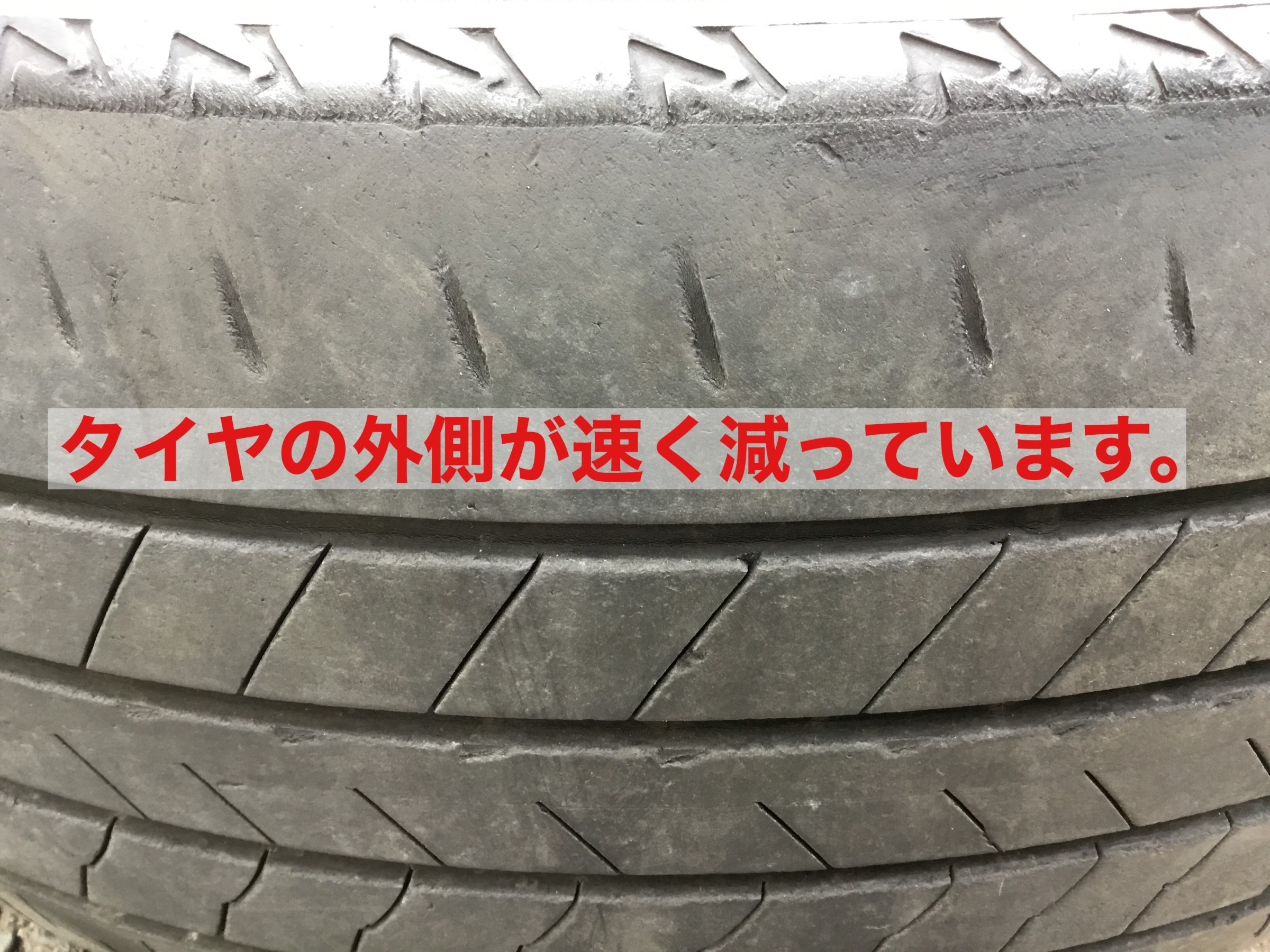 タイヤ減り方が偏って減っていました。いろいろ要因はありますが、その一つが車へのタイヤの取付角度の不適正・アライメントの角度がずれてしまっている可能性があります。タイヤ本来の性能を出す為・タイヤを長持ちさせるためにもアライメント調整をお勧めします。