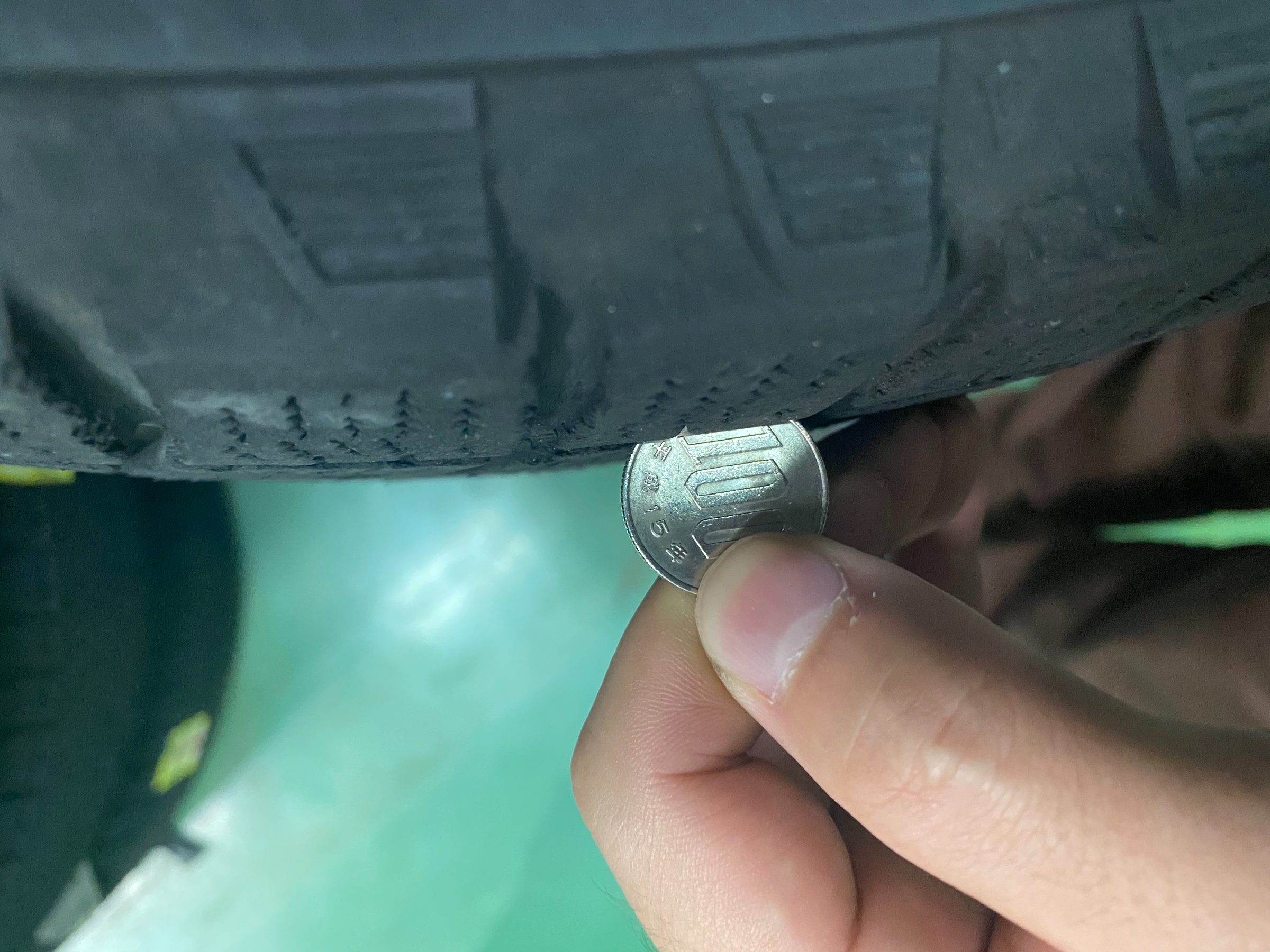 100円玉でスタッドレスタイヤの溝を確認!!($・・)/~~