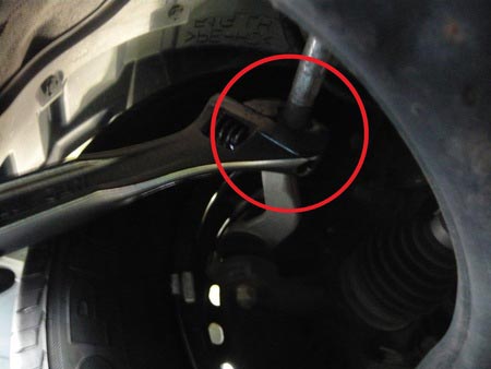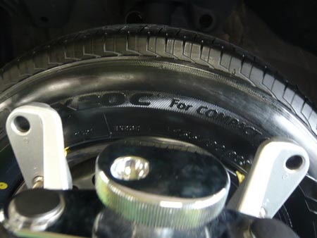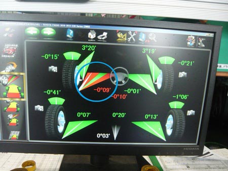 ネジを調節して(画像4)このお車の基準値はトーが左右ともに-0°03′ 0°03′なので