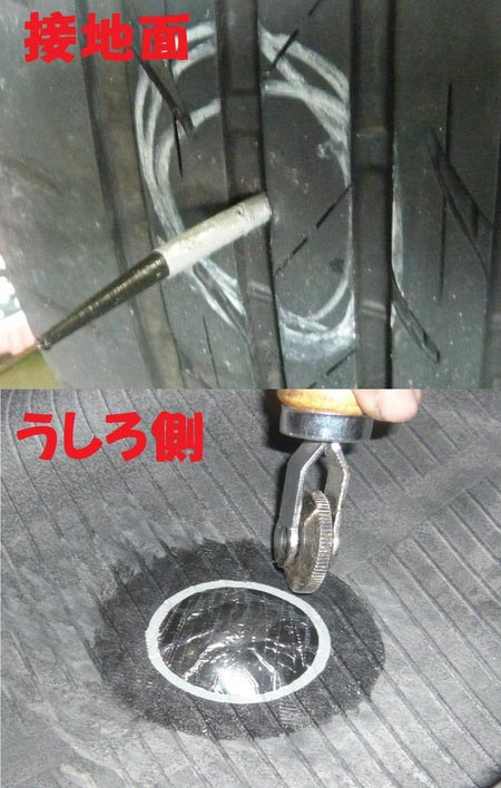 タイヤの内側から穴をふさぐ形になります。(画像2枚目)