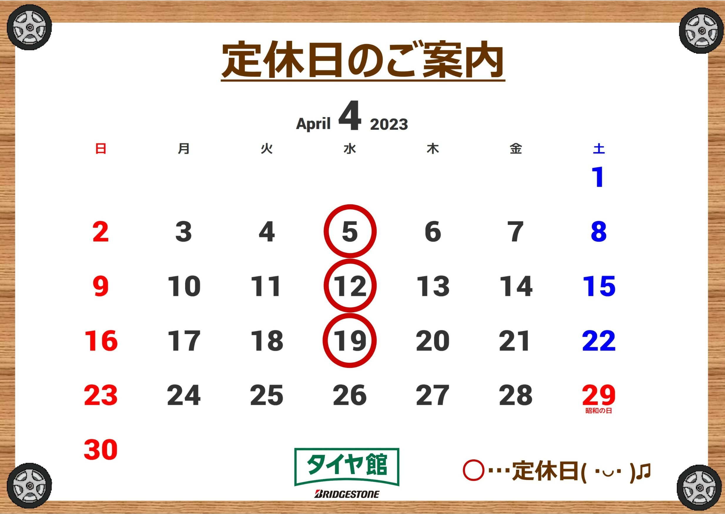 【4月】の定休日のご案内です。