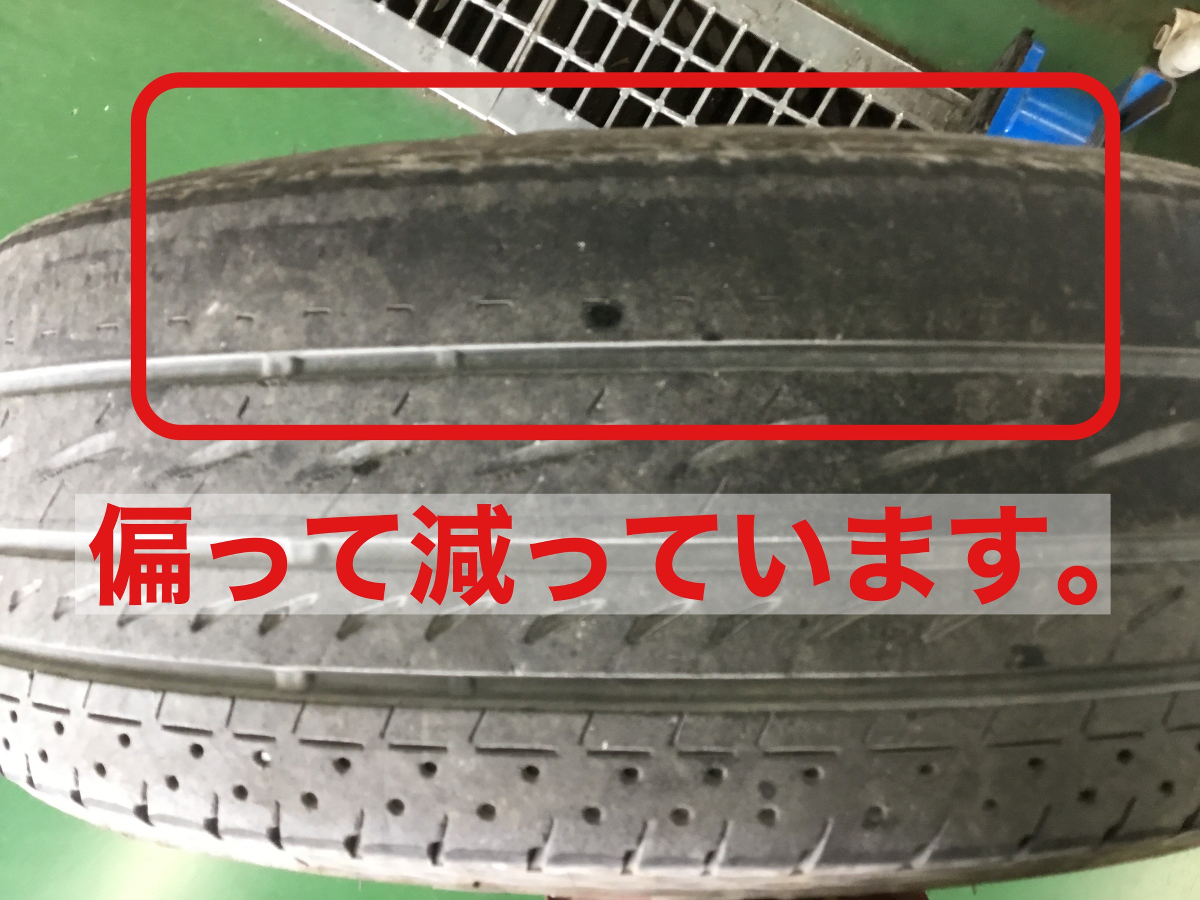タイヤ減り方が偏って減っていました。いろいろ要因はありますが、その一つが車へのタイヤの取付角度の不適正・アライメントの角度がずれてしまっている可能性があります。タイヤ本来の性能を出す為・タイヤを長持ちさせるためにもアライメント調整をお勧めします。