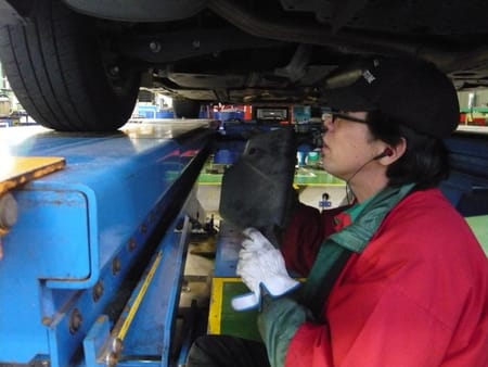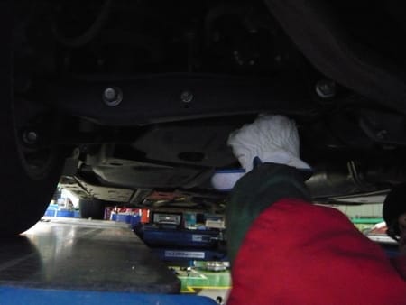 写真は、後ろのアライメント調整のために、近くにある部品を外しているところになります。