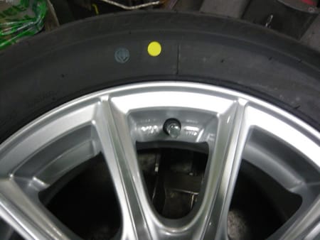 新しいタイヤには黄色い点が付いていますが、バランスをとり易くする目印になります。