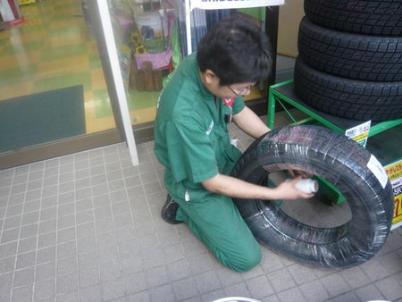 スタッフの山本君が一生懸命タイヤにラッピングしております!!