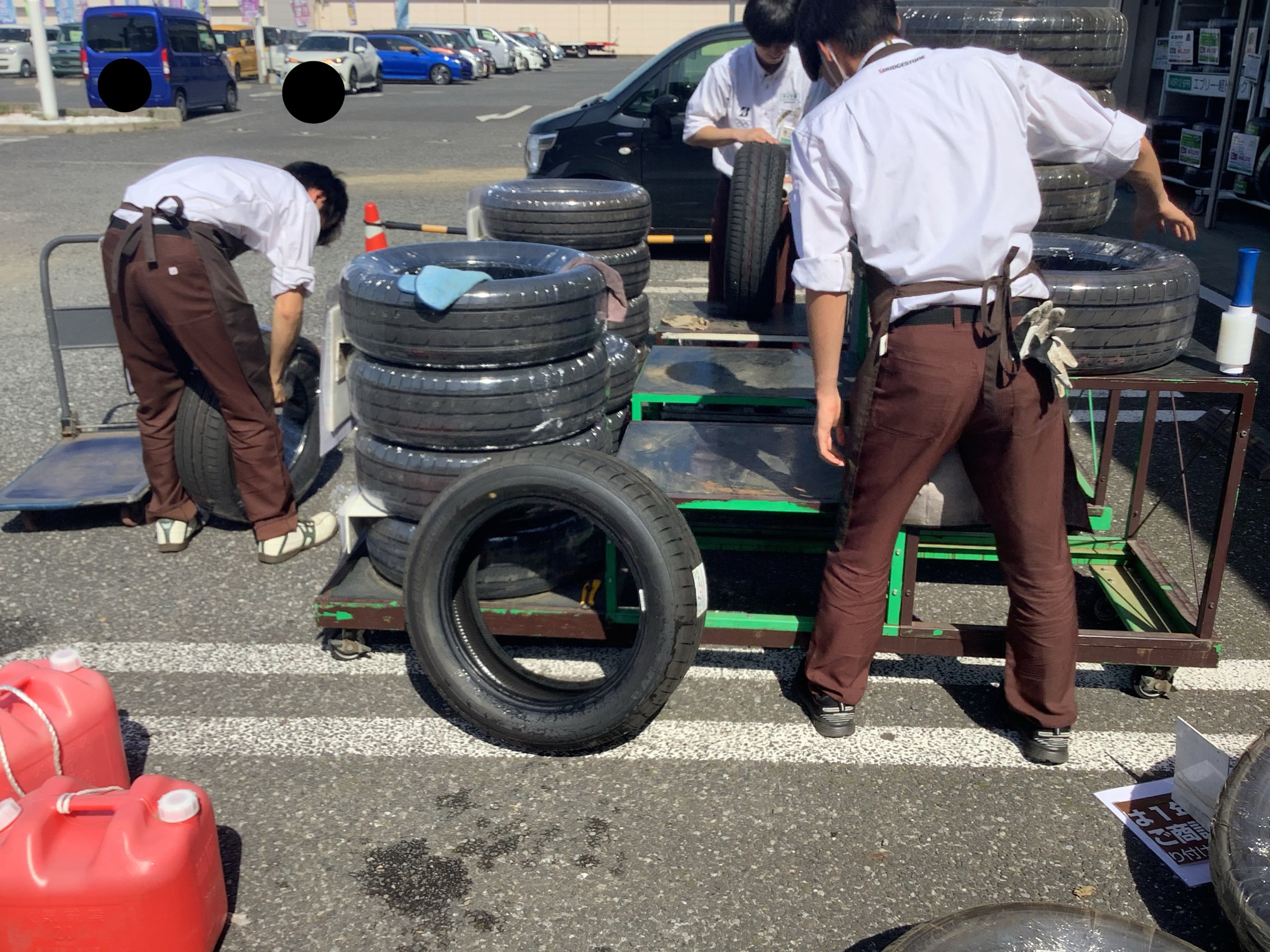 展示タイヤの保護材が傷んできたので、合間の時間を使い展示タイヤを綺麗に直しております