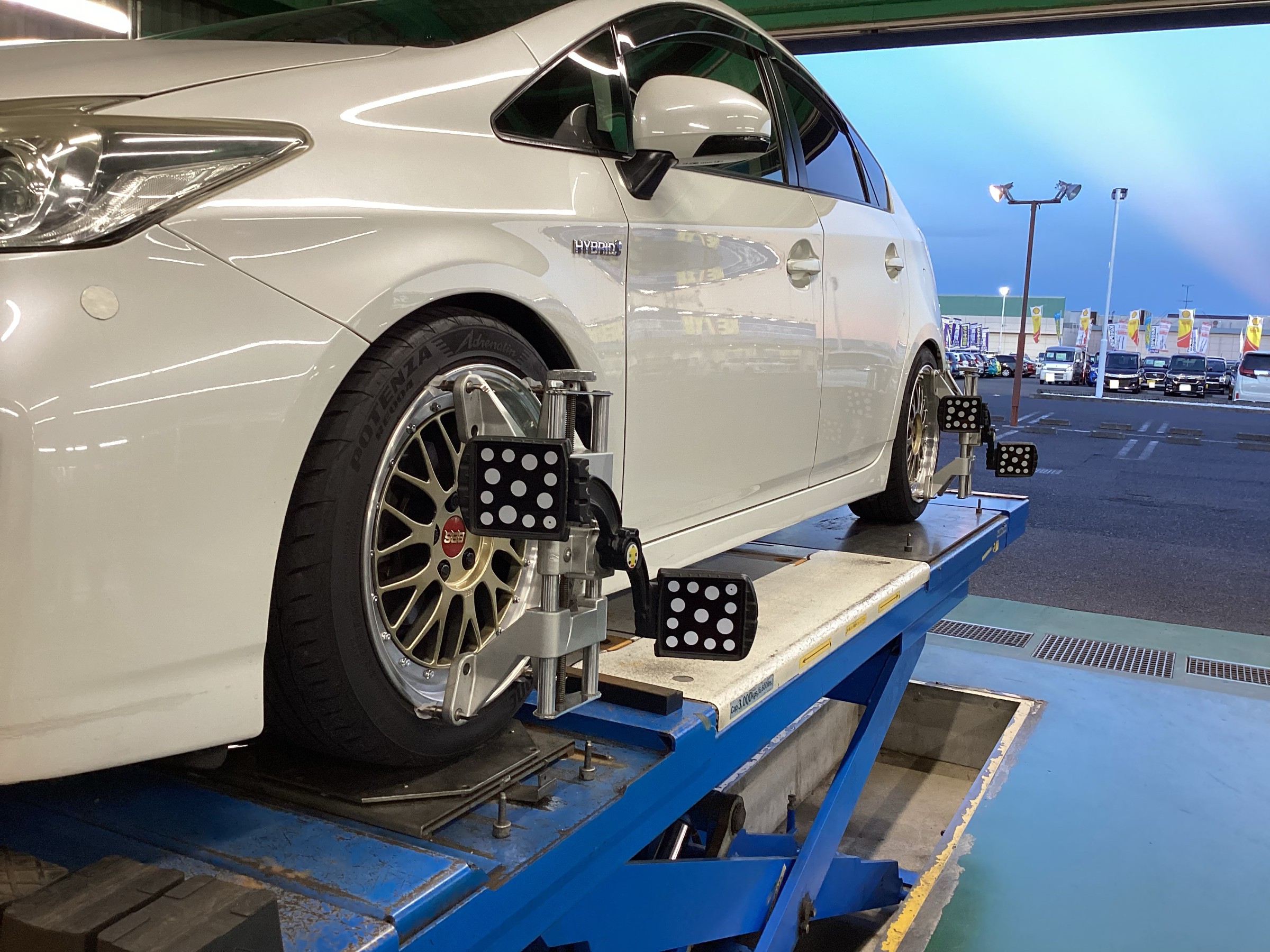 タイヤ館では、その微妙な角度の狂いを測定し、タイヤの偏摩耗の軽減、直進時や旋回時の走行の安定性向上のため、バランスよく良好な状態となるよう調整を行なう作業をしております!