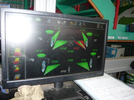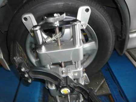 アライメントの調整は4枚目のようにタイヤに特殊な反射板を取り付けて