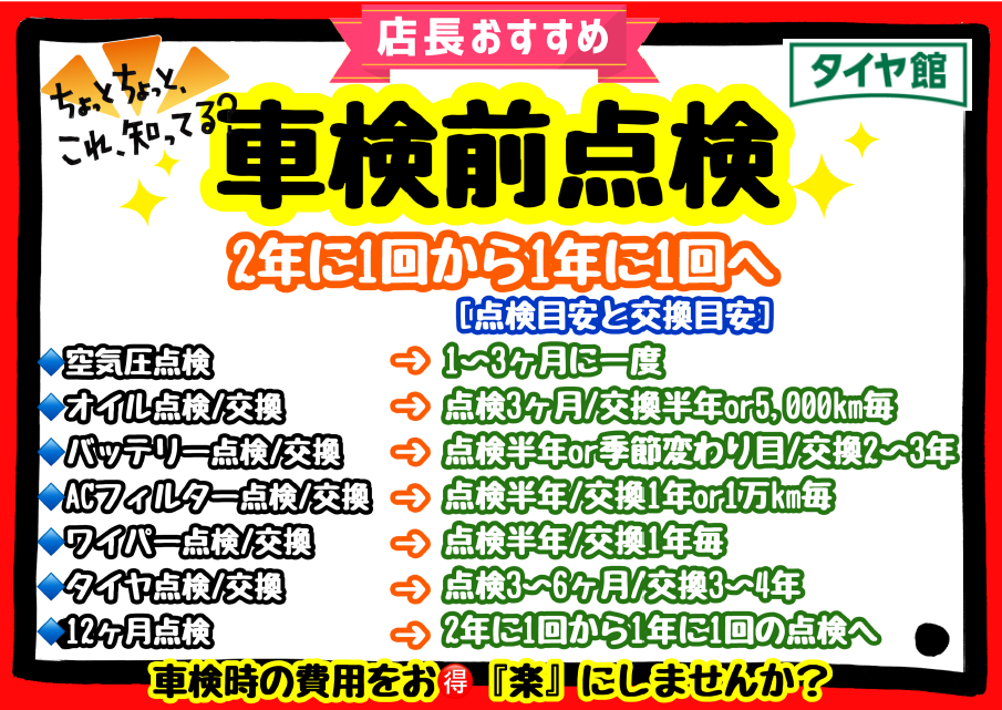 車検前点検実地中! ポスト 2025年9月30日 タイヤ館千葉ニュータウン店からの お知らせになります 車検の時にまとめて整備すると高額になることが多いですよね、当店では整備を分散していく事で車検時の費用負担を抑えていきませんか? 下記の点検は当店では無料にて実施しております(12カ月点検は除く) ※12カ月点検も予約にて受付中 本日のタイヤ履き替え順番待ち予約 ※クローク契約会員の方はご利用いただけません タイヤ履き替え(タイヤのみ) タイヤ履き替え(ホイールあり) ヘッドライトコーティング ワイパー交換 除菌・消臭 窒素ガス充填 防錆コーティング(ハブ) 防錆コーティング(下回り全防錆) カテゴリ:車検