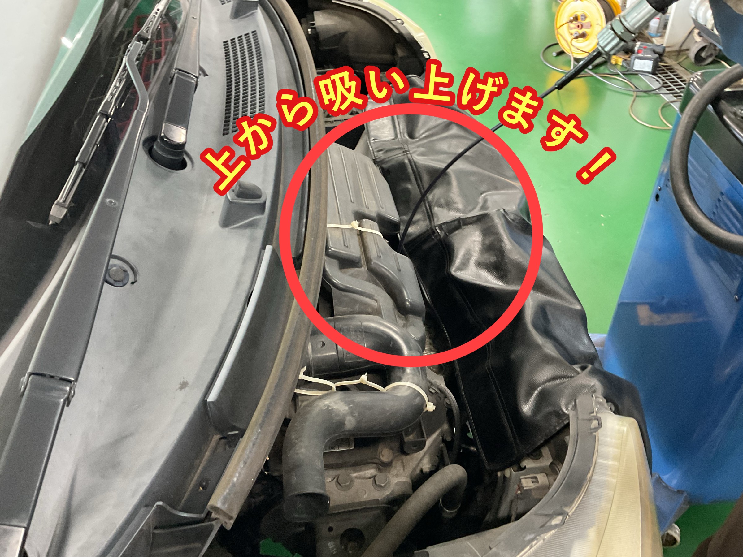 今回はお車のエンジンルームから古いオイルを抜きます!