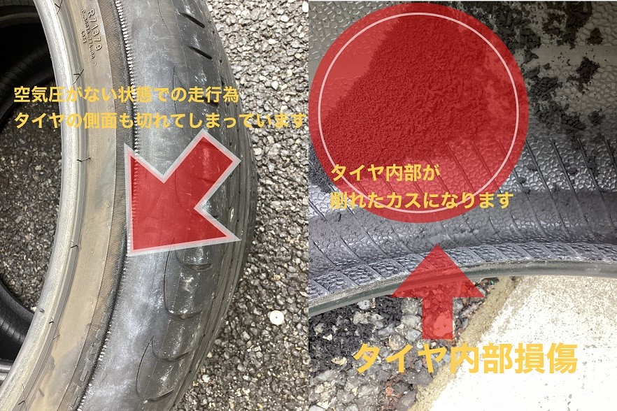 空気圧が低下したことでタイヤが潰れたことで側面と内部のタイヤのゴムが損傷しました