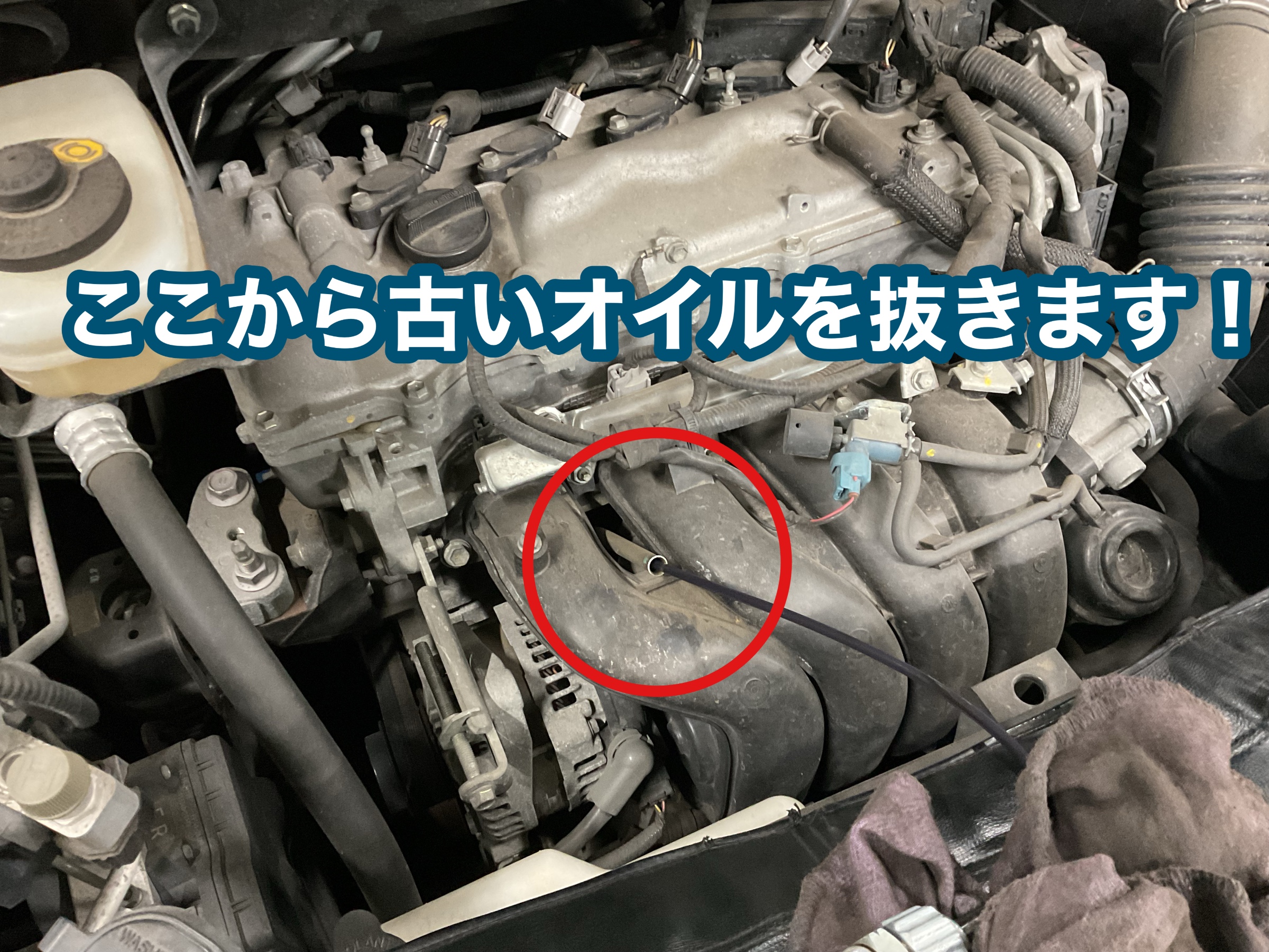 今回はお車のエンジンルームから古いオイルを抜きます!