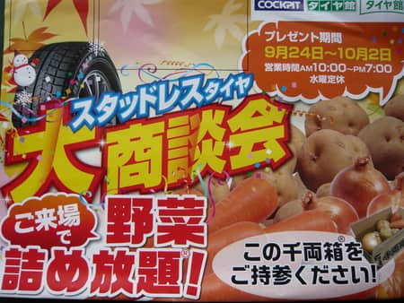 イベントで行っていた野菜つめ放題もまだやっておりますので、野菜の高い今の時期、タイヤも野菜も経済的にゲットしては如何でしょうか!!