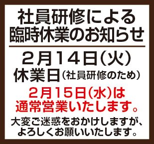 2月14日は臨時休業を致しまして御迷惑をお掛けいたしました。