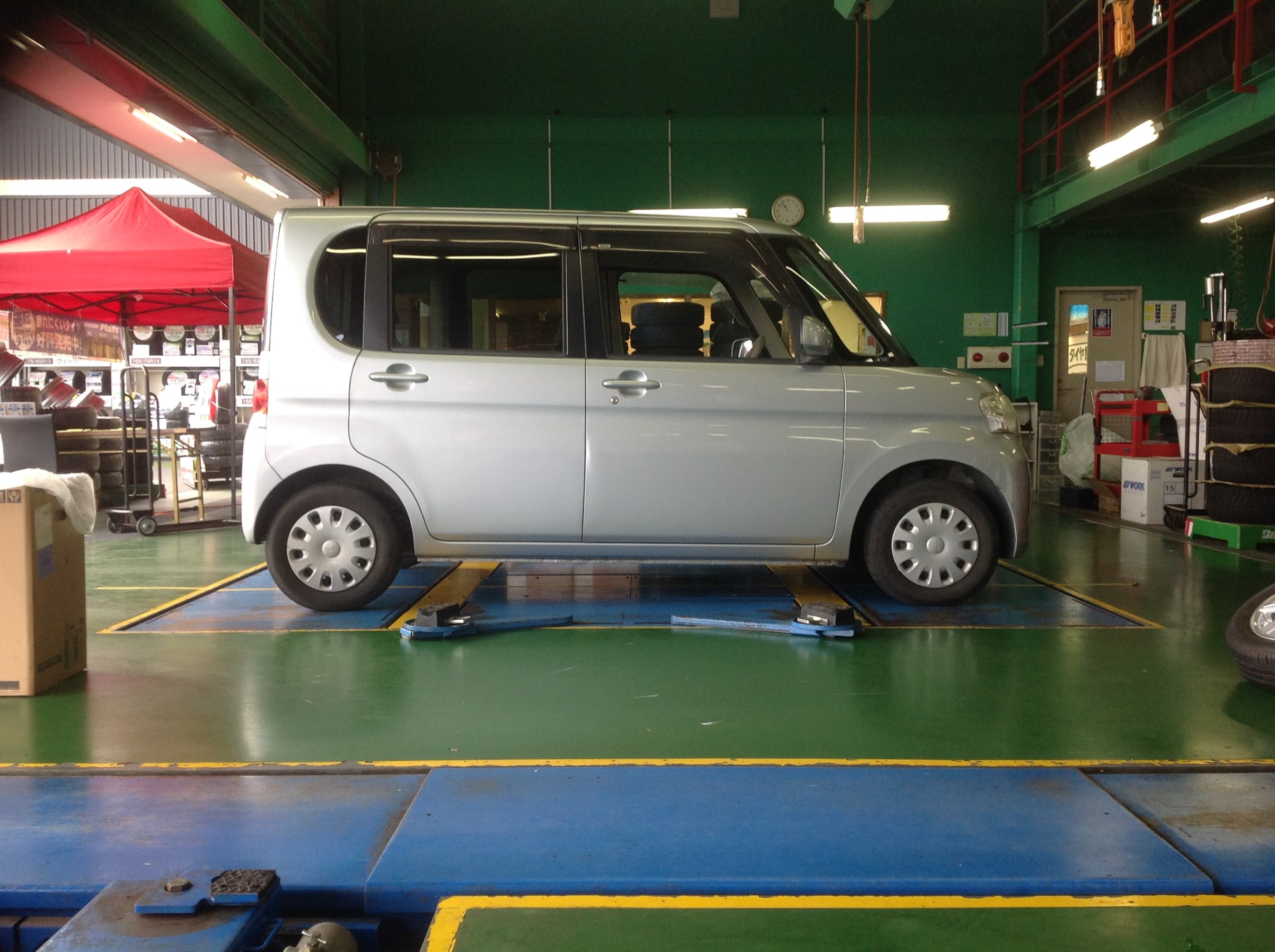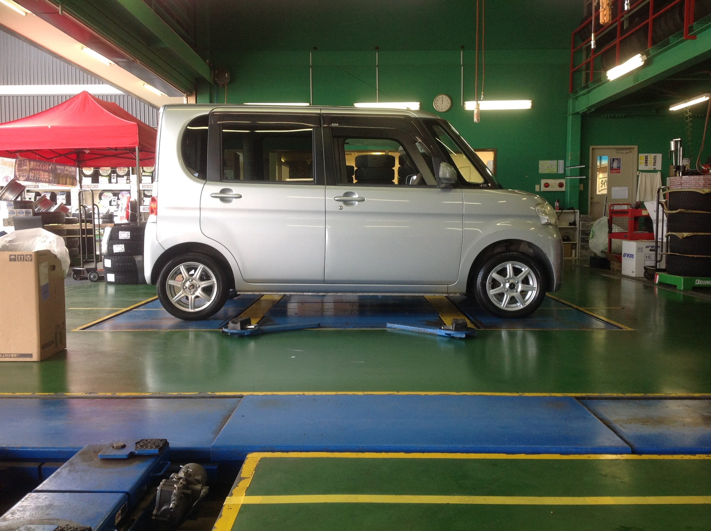 最初はダイハツ純正のスチールホイール装着車でしたが、13インチということもあり今回は車両安定性の高い14インチへインチアップしてのお取り付けをさせていただくこととなりました。
