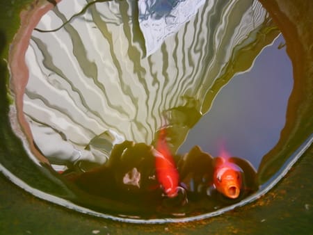 ピット裏に植木鉢を水槽にして2匹の金魚がいます