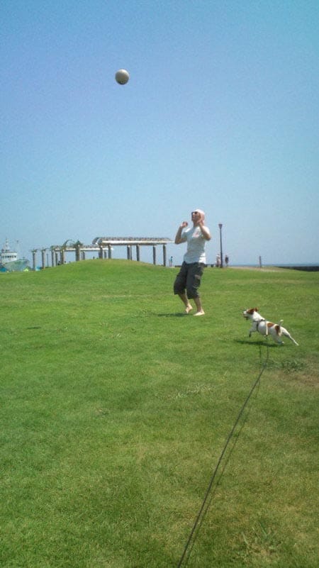 なぜか、芝生の上で愛犬とバレーボール