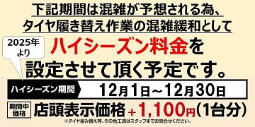 タイヤ館千葉ニュータウン店のホームページをご覧いただきありがとうございます! スタッドレスタイヤへの交換が始まりました 今年から12月1日~12/30の履き替え料金が値上げとなりますので11月中に履き替えをお勧めいたします タイヤ館ではタイヤ保管サービスも行っております
