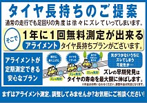 アライメント測定無料実施中! アライメントの長持ちプランに御加入いただいている方。 忘れちゃってないですか!? せっかく買って頂いたタイヤを長く・上手にご使用いただく為のプランンになります。 ★目安は1年位★ 4回までの、無料測定を行っていますのでお忘れなく! ※無料測定実施に関するお願...