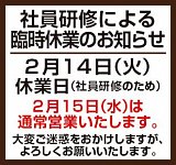 明日は臨時休業させていただきますっ 2月14日(火)は臨時休業させていただきますっ 御迷惑お掛けいたしますが御容赦下さい。