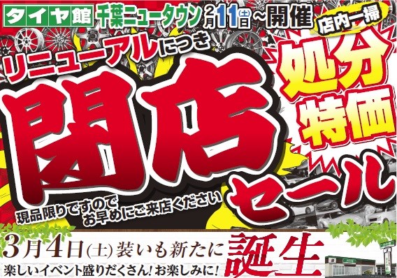 2月11日~2月19日まで 店舗リニューアルにつき売りつくしセールを開催致します。 処分価格品多数ご用意しますので、お楽しみにっ!