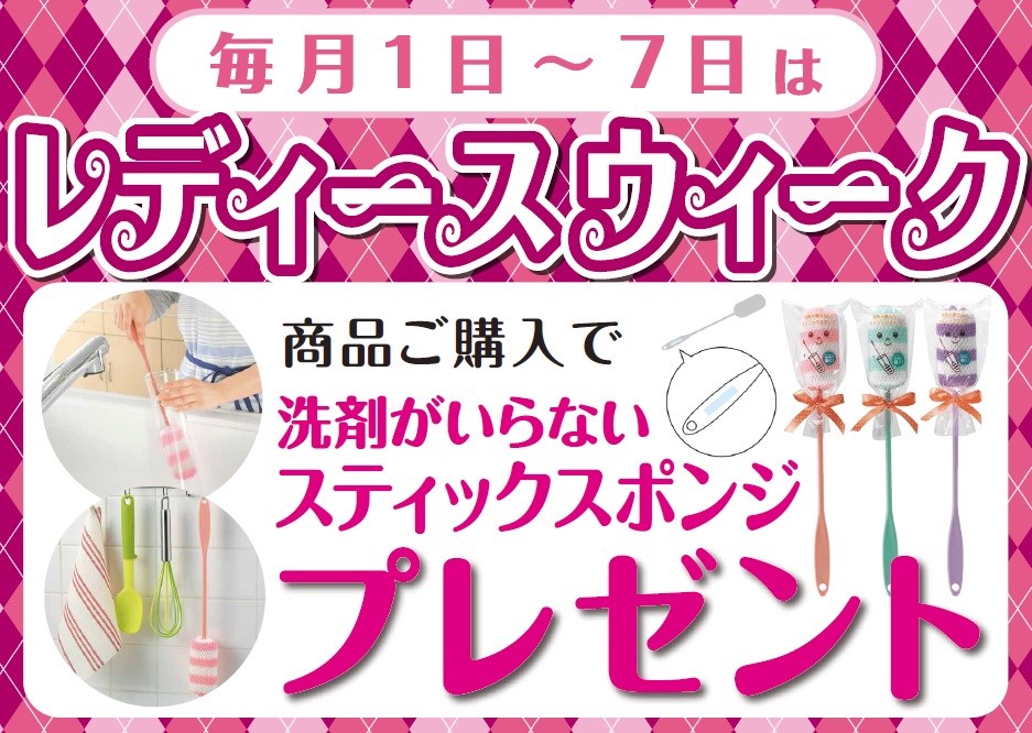 今月も1日~7日まで、レディースウィーク開催中っ! ちょっと便利な、スティックスポンジ差し上げますっ! コップやタンブラーの洗い物に便利っ。 タイヤの空気圧点検・オイル交換・これからの季節にエアコンフィルターの点検は如何でしょうか? お気軽に、ご用命下さいっ!