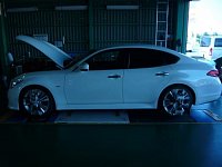 本日は、某修理屋さんよりご指名いただきました! 足回りの交換をされたとの事で、アライメントの調整をして欲しいとのことでご入庫になります。 お車はニッサン・フーガ 20インチのホイールを装着されていました!
