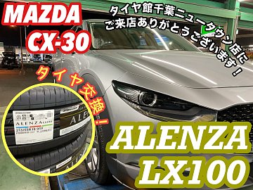タイヤ館千葉ニュータウン店のホームページをご覧いただきありがとうございます! 今回は、【マツダ/CX-30】のタイヤ交換のご紹介です! 今回は、ALENZA LX100に交換です!! 215/55R18です! このタイヤはSUV専用設計となっており、基本性能はもちろん静粛性能が高くとてもプレミアムなタイヤです...