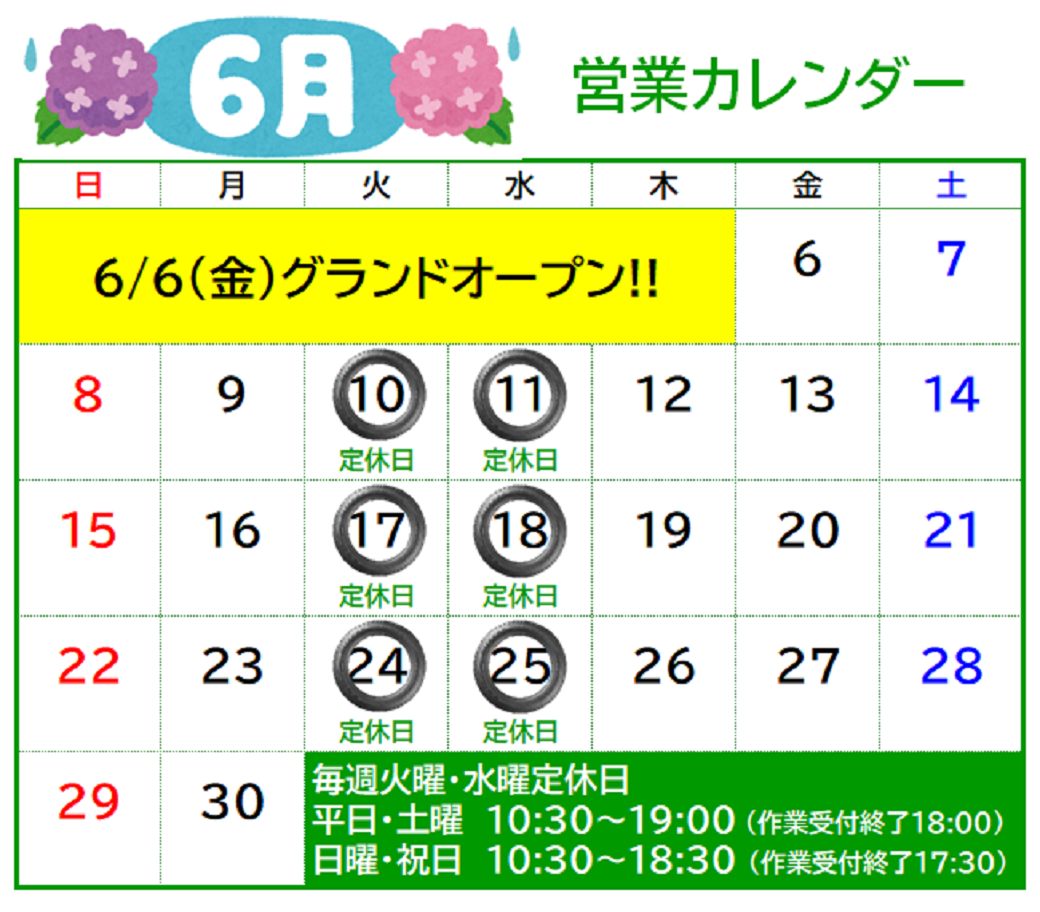 6月の定休日と営業時間のお知らせ ポスト 2025年5月31日 6月6日(金)12:00、グランドオープン! 地域の皆様の安心安全なカーライフをスタッフ 一同サポートいたします! 皆様のご来店、心よりお待ちしております。 6月・7月は、毎週火曜・水曜が定休日 日曜・祝日が18:30閉店となります。 タイヤ館 千曲 住所:389-0802長野県千曲市内川795-2 電話番号: 026-214-5515 カテゴリ:お知らせ 担当:柴﨑