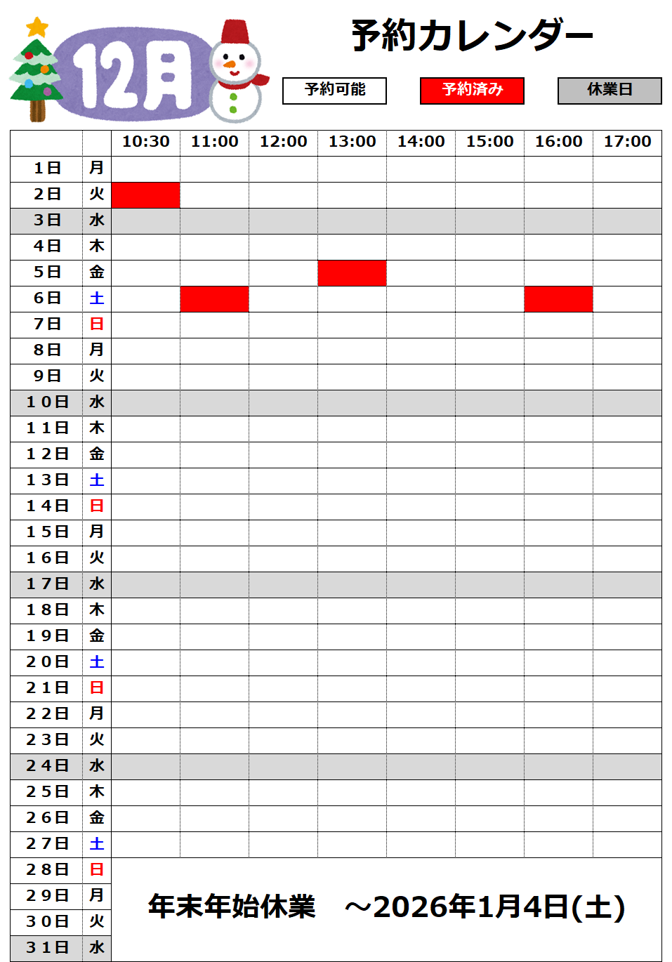 10月6日16:00現在 予約状況 ポスト 2025年10月6日 現在の作業予約の状況です。 空きが多くあるので、早めの予約で ご都合のいい日時の予約がとれます! 長期予報では11月は気温の高い予報ですが、 12月に入ると一気に冷え込みそうな予報です。 暖かい予報でもタイヤ交換は例年通りがおすすめです。 定休日や営業時間外では、 WEB予約をご活用ください。 担当:柴﨑
